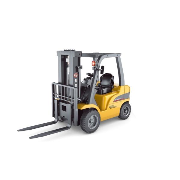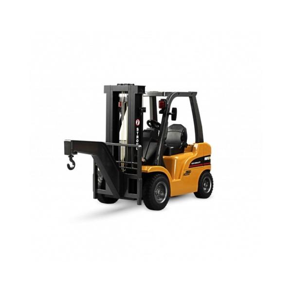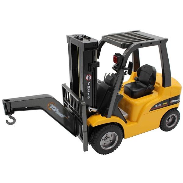 Rám kabiny, vidlice a rameno s nakládacím hákem jsou vyrobeny z kvalitního kovu, což zajišťuje vysokou odolnost a stabilitu během provozu. Další části jsou zhotoveny z ekologického a odolného ABS plastu, zatímco pneumatiky jsou vyrobeny ze skutečné gumy, což přispívá k lepší přilnavosti a věrnosti pohybu.