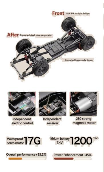 Model je vybavený pohonom všetkých štyroch kolies (4x4) a silným jednosmerným motorom, vďaka ktorému zvláda stúpanie až do uhla 46°. Svetlá výška 40 mm a mäkké pneumatiky z kvalitnej soft gumy s hlbokým vzorom zabezpečujú skvelú trakciu aj na náročnom povrchu.