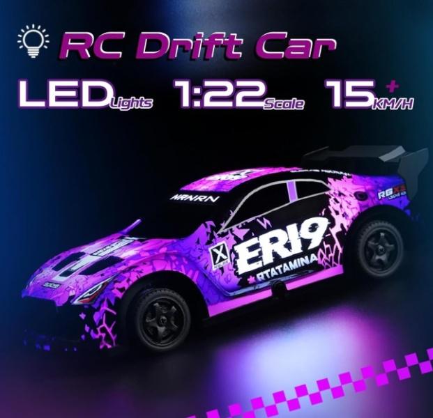 RC driftovacie auto v mierke 1:22 predstavuje zábavný model vhodný pre všetkých, ktorí majú radi rýchlu a precíznu jazdu. Vďaka dvom sadám kolies – cestným s hlbokým vzorom pre lepšiu trakciu a hladkým driftovacím – si môžete ľahko prispôsobiť jazdu podľa povrchu a štýlu. Karoséria s ružovo-fialovým vzorom je vyrobená z odolného plastu a je vybavená kompletným LED podsvietením, ktoré možno ovládať na diaľku v niekoľkých režimoch: stále svietenie, dve rýchlosti blikania, pulzujúci efekt alebo úplné zhasnutie.