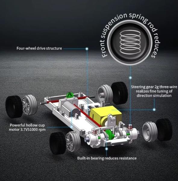 Součástí balení jsou dvě sady pneumatik: hladké plastové pro driftování a gumové pro běžnou silniční jízdu, což umožňuje využití auta jak v interiéru, tak venku. Díky plně proporcionálnímu ovládání můžete plynule zrychlovat, zpomalovat i zatáčet, což zajišťuje maximální kontrolu nad vozidlem při všech manévrech.