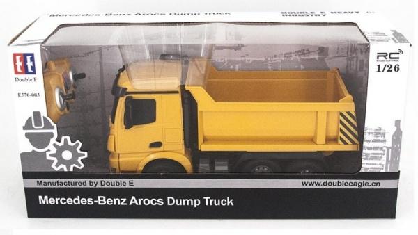 RC model 1:26 je licencovanou kopií sklápěče Mercedes Benz od Double Eagle. Sklápěč-E570-003 je dokonalým znázorněním originálního žlutého vozidla s velkými koly. Tento plně funkční stroj určený pro práce je ideálním dárkem pro každého nadšeného řidiče. Model má pohon na zadních kolech a může jezdit: dopředu, dozadu, otáčet se do stran… Je vybaven funkcí: dálkového zvedání/spouštění lehkého přívěsu, automatického vypnutí – v případě dlouhodobé nečinnosti a světelnými/zvukovými efekty.