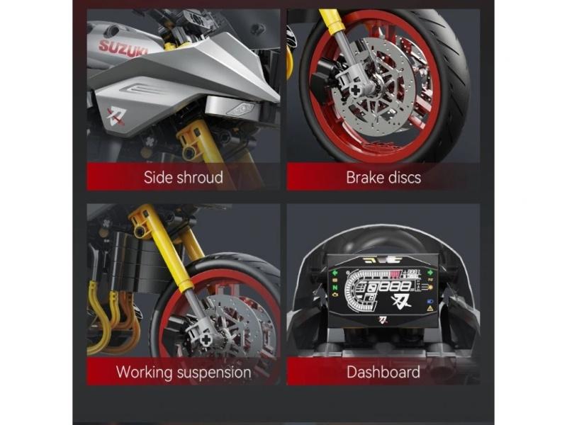 Tato stavebnice představuje detailní model legendární motorky Suzuki Katana 2022, sestavený z 1104 dílků. Díky přesnému měřítku 1:6 nabízí věrné zpracování a možnost sestavení funkčních prvků, které ocení každý milovník modelářství i motocyklů.