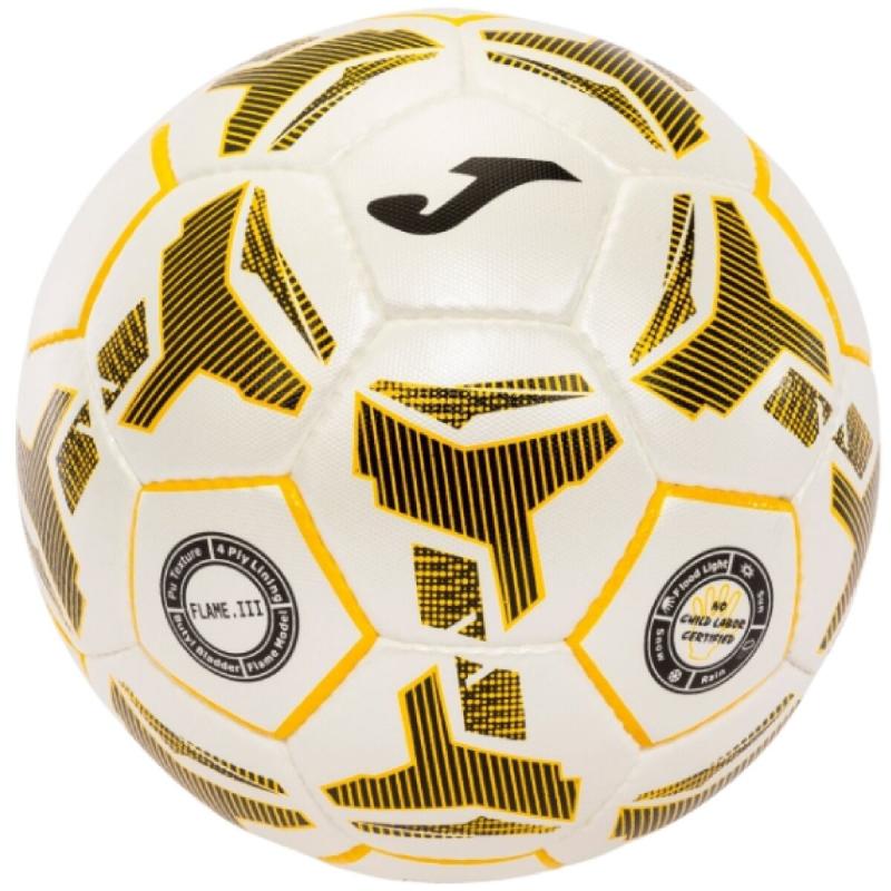 Fotbalový míč JOMA Flame III je navržený pro hru na umělém i přírodním trávníku. Je vhodný pro trénink i zápasy hráčů všech výkonnostních úrovní. Lepený míč velikosti č. 5 je tvořený ze 32 panelů vyrobených z kombinace materiálů (42% Viscose, 38% Polyurethane, 13% Latex, 7% Nylon). Díky jeho kvalitnímu zpracování nabízí skvělé vlastnosti i při použití na mokrém povrchu, drží si svůj tvar a hmotnost. Jeho speciální povrch a vnitřní butylová vzdušnice zajišťují lepší trajektorii letu.Upozornění: míče nafukujte vždy pouze pomocí navlhčené jehly na doporučený tlak (uvedeno na míči), jinak hrozí jeho poškození.
