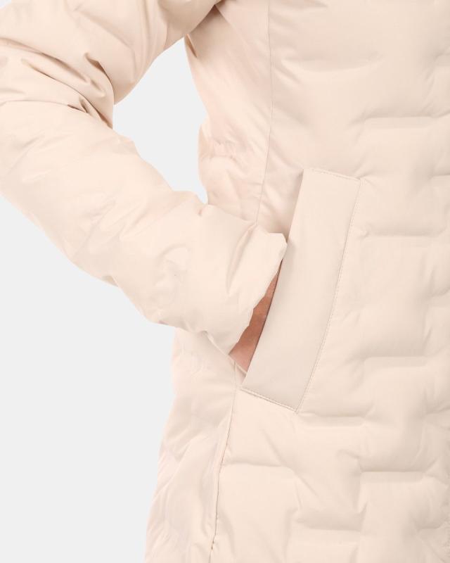 Izoláciu zabezpečuje ľahká a hrejivá syntetická výplň, ktorá udrží teplo rovnako efektívne ako páperové materiály, ale je odolnejšia voči vlhkosti a ľahšie sa udržiava. Moderný dizajn dopĺňa efektívny lepený vzor, ktorý zvyšuje odolnosť proti prenikaniu vody a dodáva kabátu štýlový vzhľad.