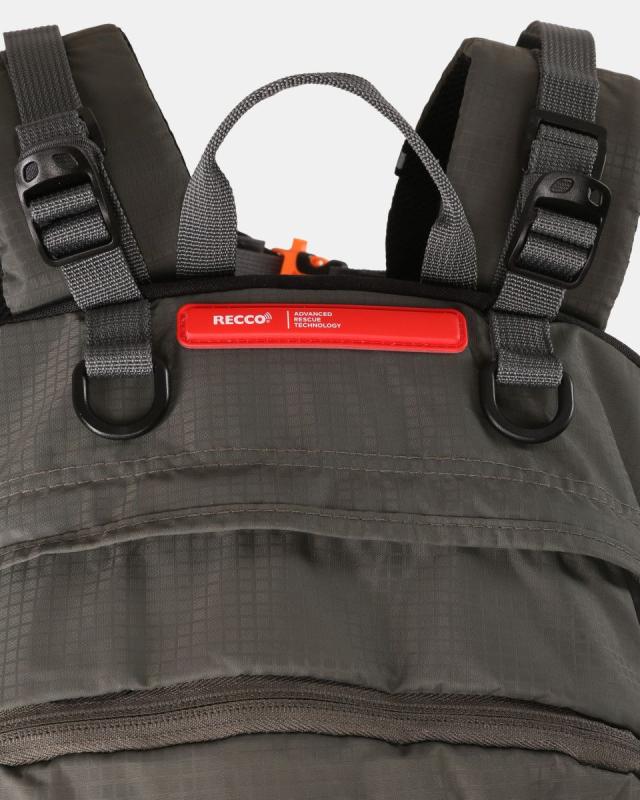 • Funkcie: nastaviteľné a vystužené ramenné popruhy, vystužený bedrový pás so zipsovými vreckami, náprsní popruh s píšťalkou, RECCO, úchyty na cepíny a turistické palice, upnutie pre lyže alebo snowboard