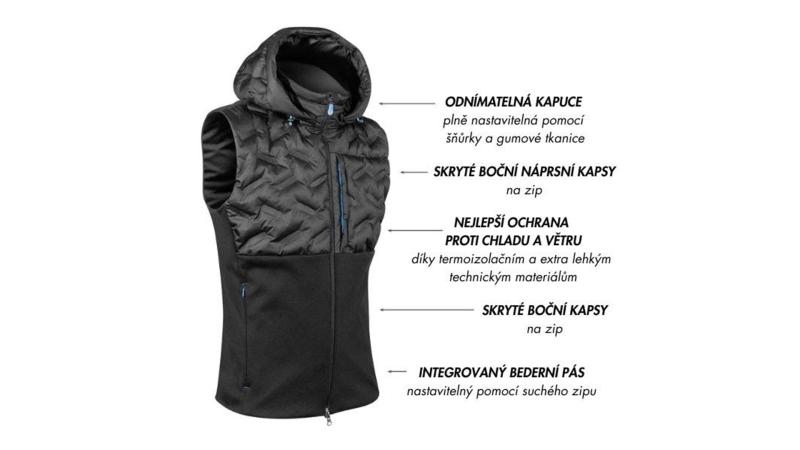 Vnější část vesty je z lehkého, odolného a větruodolného materiálu, který poskytuje ochranu proti nepříznivému počasí, zatímco vnitřní termo polstrování udržuje tělo v teple i během chladných dní. Díky tomu je vesta vhodná pro celodenní nošení při různých aktivitách v chladném prostředí.