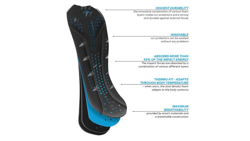Klíčovou součástí je vícevstvený chránič Cross 6.0 vyrobený z adaptivní dvouhustotní pěny s certifikací EN 1621-2. Tento materiál je navržen tak, že při běžném pohybu zůstává měkký a flexibilní, ale při nárazu okamžitě ztvrdne a efektivně absorbuje energii, čímž chrání páteř před zraněním.