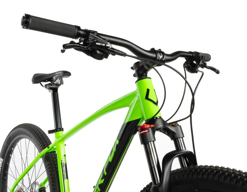 Pružinová přední vidlice s 100mm zdvihem účinně tlumí nárazy a nerovnosti, což zvyšuje pohodlí a kontrolu během jízdy přes kořeny, kameny či zpevněné cesty. Díky tomu zvládnete i náročnější trasy s větší lehkostí.