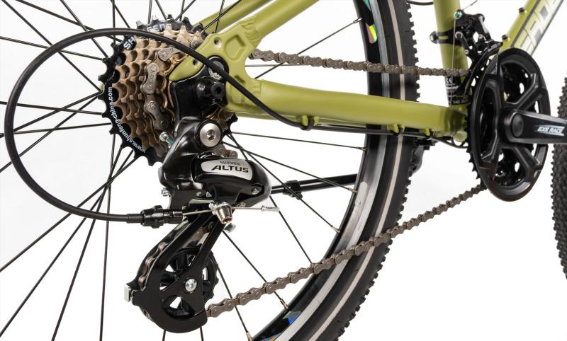 Pláště CST 24x2,10 poskytují dobrou stabilitu a přilnavost na různých površích. Kolo je vybaveno spolehlivým systémem 1×7 rychlostí od SHIMANO, který umožňuje intuitivní řazení a pokrývá většinu situací v terénu. Díky tomu si dítě snadno poradí s různými náročnostmi trasy.