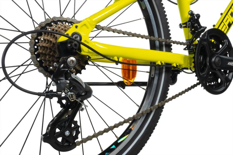 Bicykel je vybavený spoľahlivým systémom prevodov 1×7 od značky SHIMANO, ktorý umožňuje intuitívne ovládanie a pokrýva široké spektrum jazdných situácií. Radiace páčky sú rozdelené na ľavú stranu so 3 rýchlosťami a pravú stranu so 7 rýchlosťami, čo uľahčuje prispôsobenie tempa a náročnosti terénu.