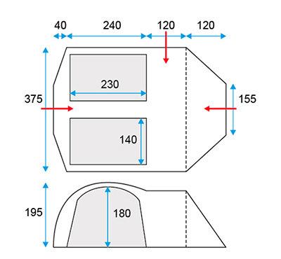 Rozměry (cm) - vnější stan (40+240+120+120)*375*180