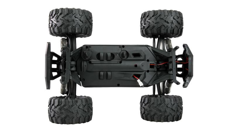 Vďaka robustnej konštrukcii a pohonu všetkých štyroch kolies zvláda rôzne terény a podmienky. Vodeodolné prevedenie a uzavretý interiér chránia dôležité komponenty pred vlhkosťou a nečistotami, čo predlžuje životnosť a spoľahlivosť modelu. Jasné LED svetlá vpredu i na streche zlepšujú viditeľnosť pri jazde za horších svetelných podmienok. Navyše je možné pripojiť ďalšie LED osvetlenie cez špeciálny kábel na regulátore rýchlosti.
