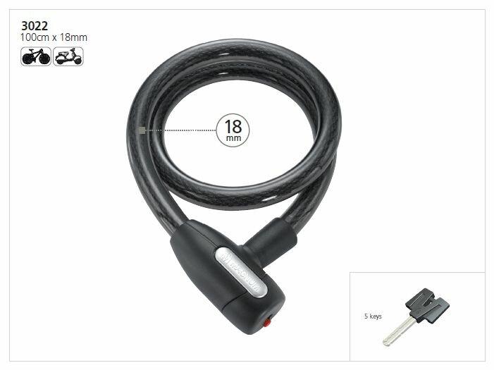 Pevné oceľové lanko s priemerom 18 mm a dĺžkou 1000 mm chránené tvrdým plastom, vybavené bezpečnostnou hlavou a piatimi kľúčmi pre spoľahlivú ochranu. zobraziť celý popis