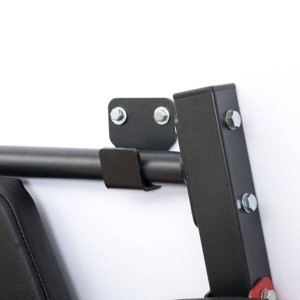 Hrazda se vkládá do profilů, ke kterým jsou připevněny loketní opěrky, a zajišťuje se šrouby s ergonomickým úchopem pro dotažení bez použití nářadí. Šíře hrazdy je 107 cm a uprostřed nalezneme oko pro zavěšení boxovacího pytle.