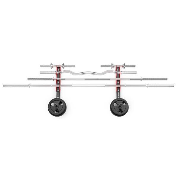 Konstrukčne ide o 2 kusy oceľových profilov určených na montáž na stenu, pričom sa každý profil pripevní pomocou 4 kotiev. Kotviaci materiál nie je súčasťou dodávky a je potrebné zvoliť vhodný druh podľa materiálu steny. Po montáži získame 4 páry držiakov na osy a 2 trny pre odkladanie závaží. Do držiaka teda môžeme odložiť až 4 obojručné osy alebo až 8 jednoručných hriadeľov. Trny pre odkladanie závaží majú dĺžku 21 centimetrov a priemer 2,5 centimetra.
