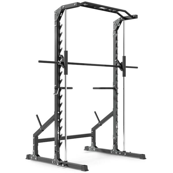 Model MS-U117 2.0 se vyznačuje mimořádně pevnou konstrukcí, která zajišťuje stabilitu i při intenzivním tréninku. Zařízení lze napevno ukotvit k podlaze, což výrazně zvyšuje bezpečnost při práci s těžkými váhami. Gumové patky chrání podlahu před poškrábáním a integrované držáky na kotouče usnadňují jejich praktické uložení. Díky těmto prvkům máte jistotu, že váš trénink bude nejen efektivní, ale také komfortní a bezpečný.