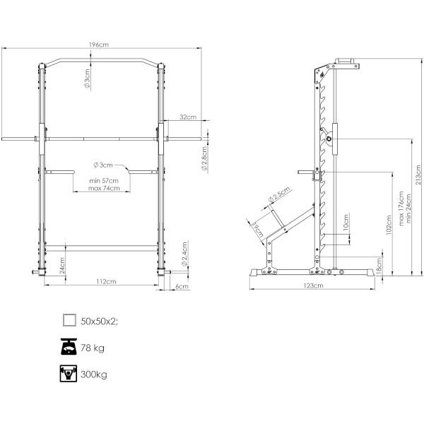 Univerzální posilovací stroj s lineárními ložisky a nastavitelnými adaptéry pro dipy a kliky, vhodný pro komplexní trénink s nosností až 300 kg. zobrazit celý popis