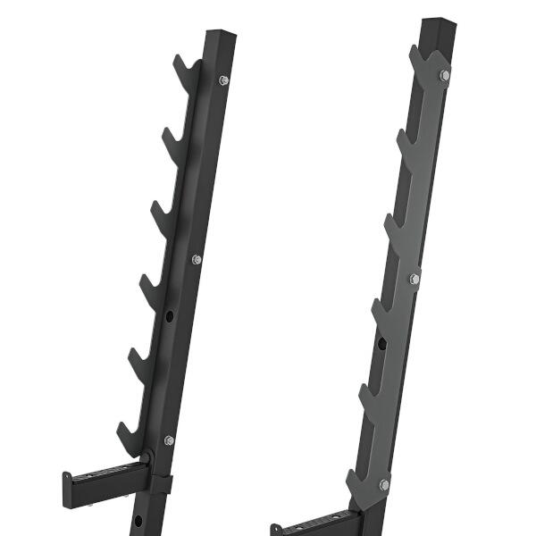 - 6 párov hákov pre odloženie činky – umožňuje variabilitu cvikov a bezpečné odloženie činky, ak nemôžete dokončiť celý pohyb.