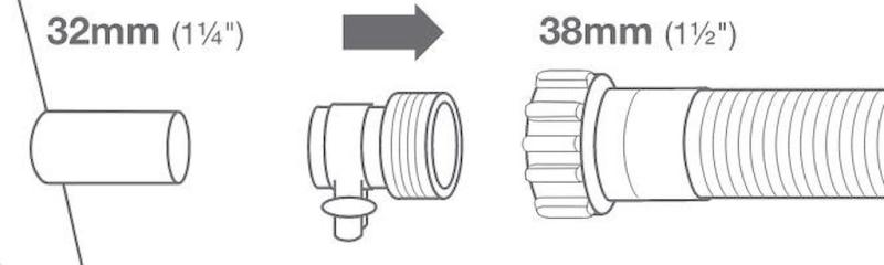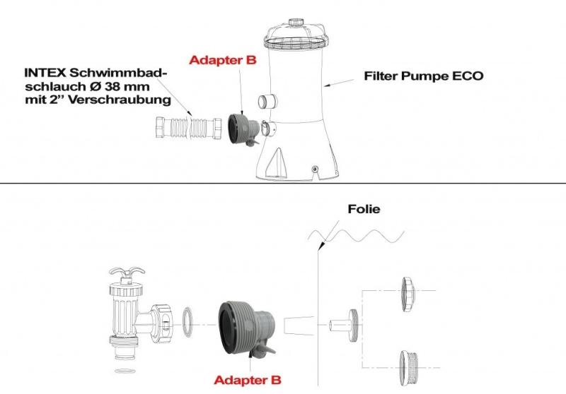 Umožňuje propojení průchodky o průměru 32 mm a šroubení hadice o průměru 38 mm u bazénů Intex.