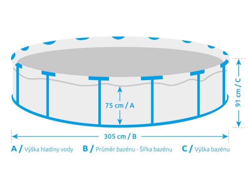 Rozmery: priemer 3,05 m; výška bazéna 0,91 m; hĺbka vody 0,75 m; celkový objem vody 5,2 m2