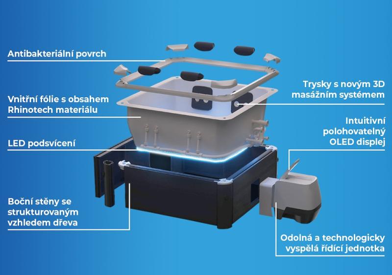 • Trysky: 140 vzduchových + 8 nastavitelných hydromasážních