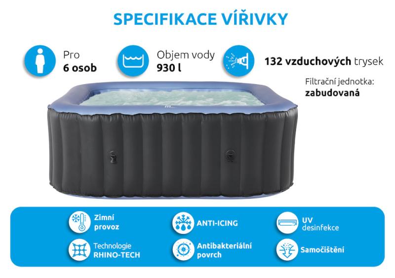 Výhodou je 132 vzduchových trysiek a účinný ohrev vody. Vo vnútri ovládacej jednotky je zabudovaná mini sterilizačná komora s UV LED lampou, ktorá zabezpečuje, že každá kvapka vody v Mspa je pod neustálou ochranou.