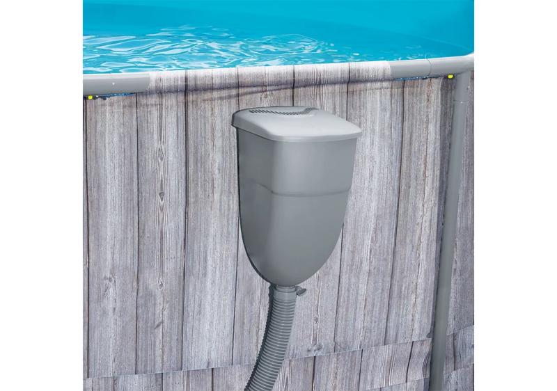 Je vybaven vestavěným skimmerem, který lze snadno propojit s pískovou filtrací. Součástí balení je také adaptér pro připojení vysavače s hadicí o průměru 32 mm, což usnadňuje údržbu vody.