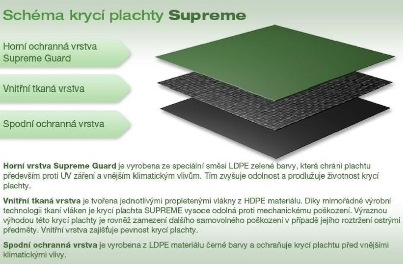Vďaka použitiu ochrannej vrstvy Supreme Guard je krycia plachta Supreme pevnejšia a lepšie odoláva poveternostným vplyvom – nejde však o zimnú plachtu a používanie pri teplotách pod bodom mrazu životnosť krycej plachty znižuje. Farba krycej plachty je zelenočierna. K bazénu ju ľahko a rýchlo uchytíte pomocou lanka a napínaka s račňou. Oceľové lanko potiahnuté plastovou ochrannou vrstvou i napínak s račňou sú súčasťou balenia.