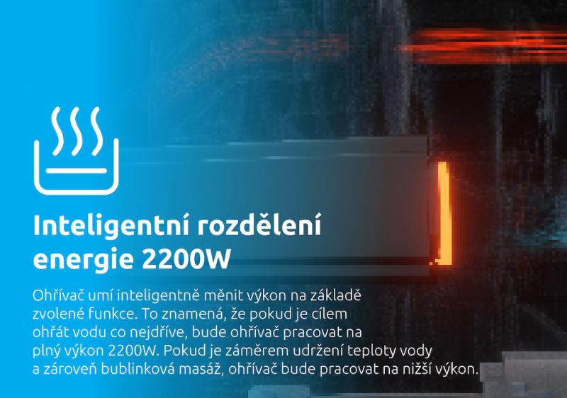 • Ohřev vody: 2 200 W, teplotní rozsah až do 40 °C, rychlost ohřevu 1,9–2,6 °C za hodinu