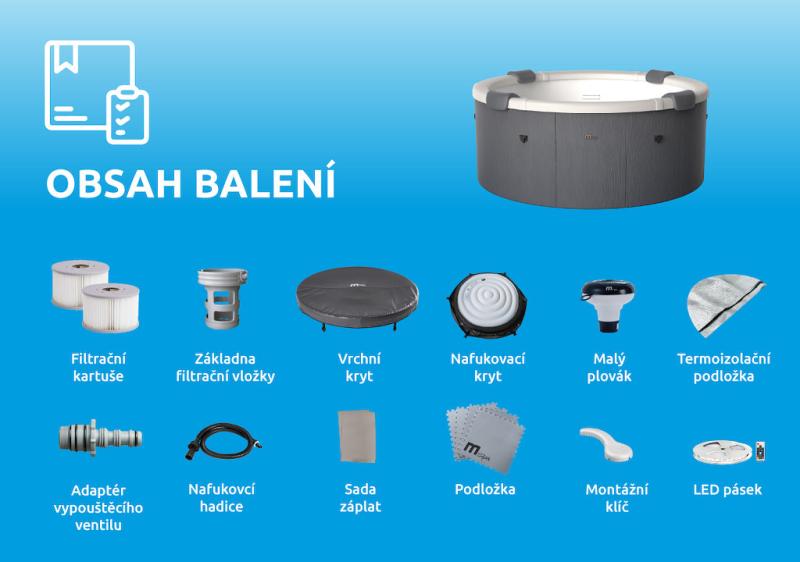 Součástí balení je vířivý bazén, ovládací a motorová jednotka, 2 filtrační vložky, základna filtrační vložky, adaptér na zahradní hadici, LED pásek, termoizolační podložka, nafukovací kryt, 4 opěrky hlavy, plovák na chemii, testovací proužky, opravná sada, návod k použití a náhradní filtrační kartuše. Vířivka není kompatibilní s připojením solárního ohřevu, chlorinátoru ani pískové filtrace.