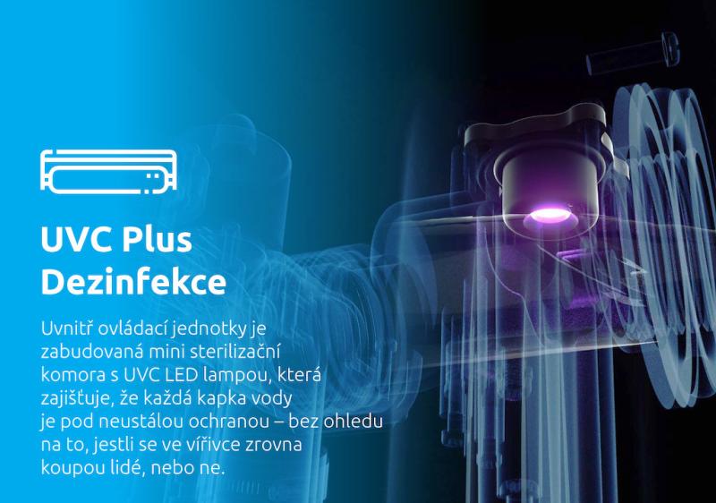 Součástí vybavení je UVC Plus dezinfekční systém, který pomocí zabudované UVC LED lampy účinně snižuje množství bakterií ve vodě až o 52 % za 4 hodiny. Lampa je bezpečně umístěná uvnitř čerpadla, takže neohrožuje oči ani pokožku. Systém ANTI-ICING hlídá teplotu vody a automaticky spustí ohřev při poklesu pod 1 °C, čímž zabraňuje zamrznutí vody a poškození zařízení.