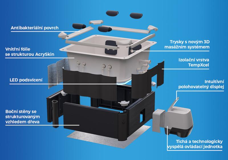 Nová izolační vrstva TempXcel zvyšuje efektivitu ohřevu o 14 % a snižuje tepelné ztráty o 38 %, zároveň chrání vířivku při přepravě. Povrchová folie AcrySkin je měkká, komfortní a odolná díky speciální akrylové úpravě, která prodlužuje životnost.
