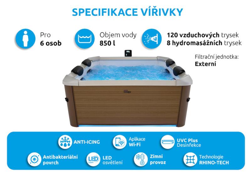 Mobilní vířivá vana pro 6 osob s 120 vzduchovými a 8 hydromasážními tryskami, účinným ohřevem a ovládáním přes aplikaci v mobilu. zobrazit celý popis