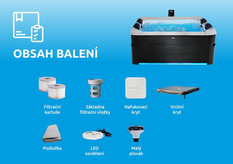 Součástí balení je vířivý bazén, ovládací a motorová jednotka, kompletní sada panelů a lišt, filtrační vložky včetně základny, termoizolační podložka z EVA pěny, adaptér na zahradní hadici, LED pásek s dálkovým ovladačem, termoizolační a nafukovací kryt, čtyři opěrky hlavy, plovák na chemii a návod k použití.