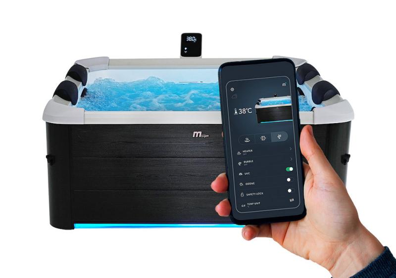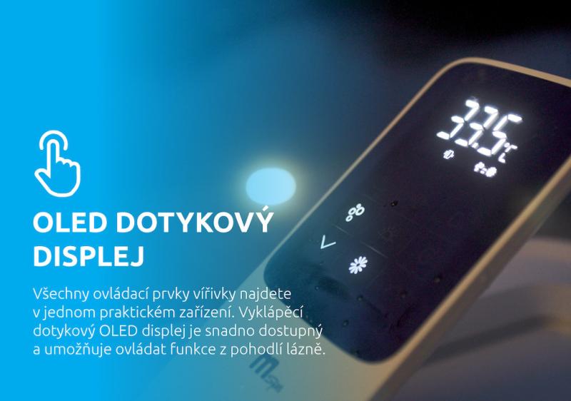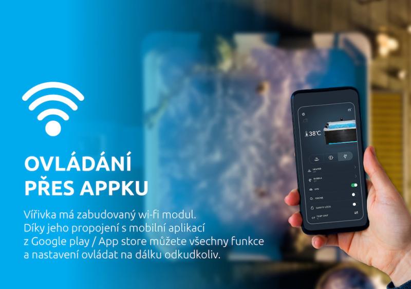 Ovládání vířivky je možné přes externí OLED dotykový panel nebo pohodlně prostřednictvím mobilní aplikace přes Wi-Fi, která umožňuje snadné nastavení všech funkcí bez nutnosti vstávat z vany.