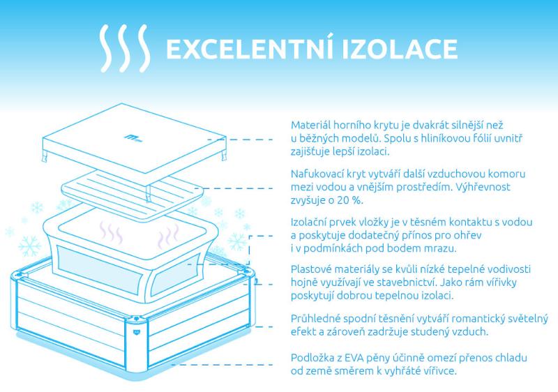 Nová izolační vrstva TempXcel zvyšuje účinnost ohřevu o 14 % a zároveň snižuje tepelné ztráty o 38 %, což přispívá ke snížení nákladů na provoz. Povrch vany je z materiálu AcrySkin, který je měkký, flexibilní a odolný díky speciální akrylové úpravě, což prodlužuje životnost a zvyšuje komfort používání. Tichý motor Whispa minimalizuje hlučnost, takže si můžete užít relaxaci pouze za zvuku bublající vody.