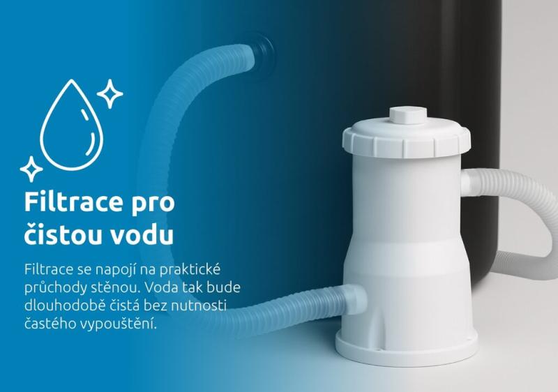 Součástí balení je kartušová filtrace včetně hadic a všech potřebných propojovacích dílů, která se snadno napojuje na průchody stěnou. Filtrace efektivně odstraňuje nečistoty, udržuje vodu průzračnou a zajišťuje pohodlné a hygienické používání bez časté výměny vody.