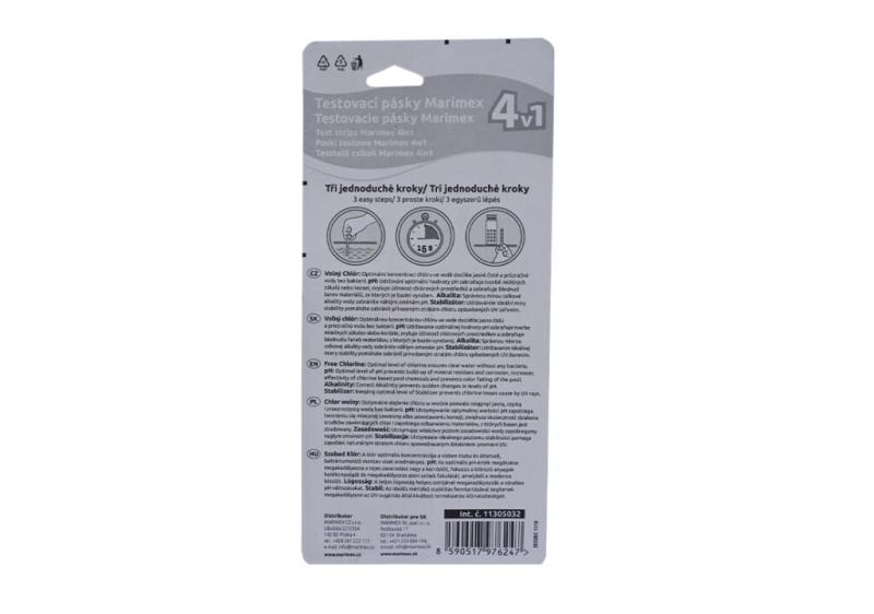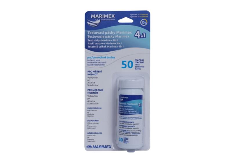 Proužkový tester Marimex 4v1 pro rodinné bazény umožňuje 50 měření, přičemž jednoduše a rychle měří hodnoty volného chlóru, pH, celkové alkality a stability vody v bazénech či vířivkách.Během třech jednoduchých kroků zjistíte hodnoty koncentrace bazénové chemie, a to již během patnácti vteřin. Pro ověření naměřených hodnot doporučujeme i nadále jednou za 14 dní použít také kapkový tester.