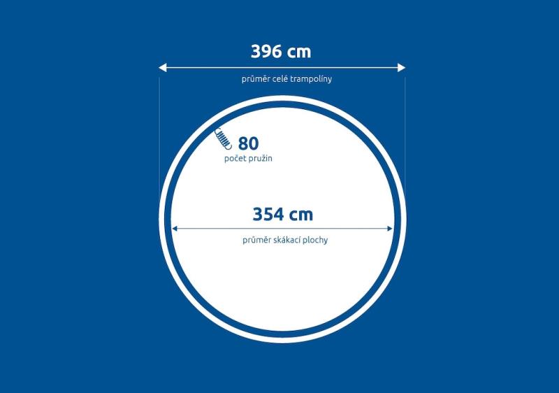 Priemer skákacej plochy: 354 cm (meria sa po vlákne tkaniny – od jedného okraja k druhému cez stred, tolerancia rozmeru ± 2 cm).