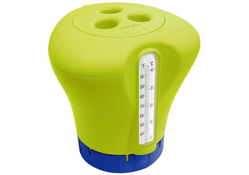 Plovák na chlor s integrovaným bazénovým teploměrem a regulační mřížkou. zobrazit celý popis