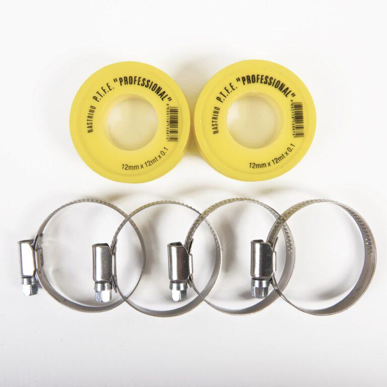 Užitočná sada na utesnenie a utiahnutie hadíc pri bazéne. Obsahuje: 2x teflónovú pásku na utesnenie spojov, 4x hadicovú sponu na utiahnutie spojov.