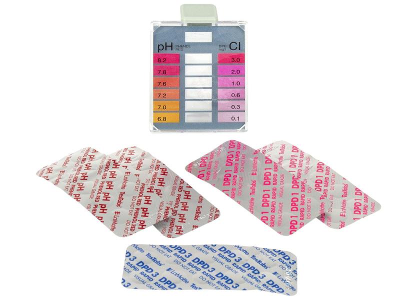 V sadě najdete samotný tester a tři druhy tablet pro měření pH a volného a vázaného chloru. Ideální hodnota pH je 6,8 až 7,2. Příliš zásadité pH od hodnoty 7,8 totiž vede k tvorbě různých minerálních zákalů, vodního kamene a jiných sraženin, stejně jako k vyšší dráždivosti vody a zvyšujícímu se obsahu škodlivého vázaného chloru. Ten vzniká při kontaktu volného chloru s potem a dalšími organickými látkami. Vázaného chloru se zbavíte použitím přípravku Chlor Shock.