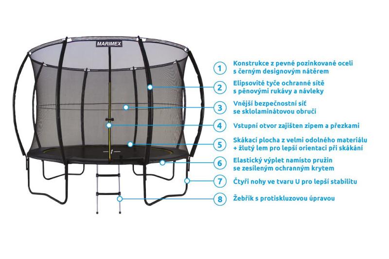 Ochrannú sieť nájdete priamo v balení, nemusíte si ju dokupovať zvlášť. Ochranná sieť na vonkajšej strane trampolíny je pružná a zároveň výborne drží tvar. Tyče sú obalené ochranným návlekom z mäkčenej peny. Nohy trampolíny sú samostatné a zvyšujú stabilitu celej trampolíny. Zvnútra aj zvonku sú galvanizované rúry rámu.