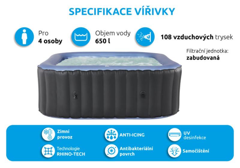 Nafukovací vířivka MSpa Tekapo C-TE042 má praktický tvar a bezvadně padne na jakoukoli terasu či zahradu. Tato mobilní vířivá vana pojme až 4 dospělé osoby zároveň!Je vybavena 108 vzduchovými tryskami a samozřejmě i účinným ohřevem vody. Uvnitř ovládací jednotky je zabudovaná mini sterilizační komora s UV LED lampou, která zajišťuje, že každá kapka vody v Mspa je pod neustálou ochranou.