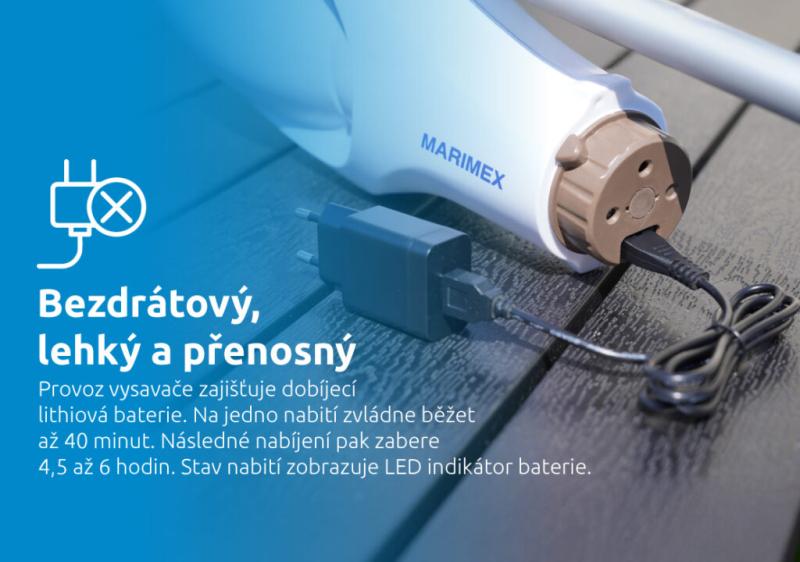 Bazénový vysavač Marimex ProStar Vac MW02 Aku set má v balení krom otočné sací hlavy a plochého kartáče, přídavný set kartáče a síťky pro ruční čištění, s možností připojení na tyč. Vysavač je vhodný pro nadzemní bazény, zapuštěné bazény a vířivky do průměru 4,57 m. Vysavač je určen pouze pro použití pod vodou. Zachytí i hrubé nečistoty, jako je například písek. Zobrazit celý popis