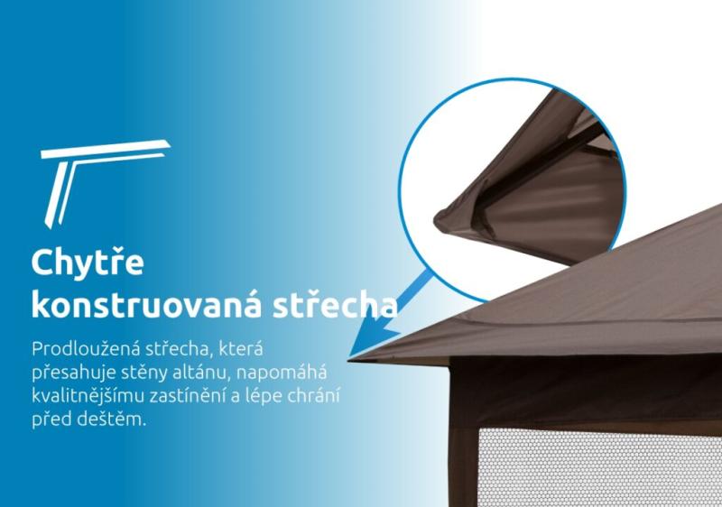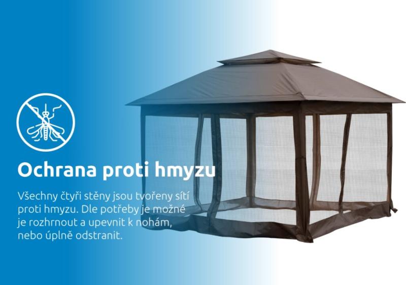 Zahradníaltán Marimex Vistanabízí moderní a elegantní design pro každou příležitost. Hlavní předností jsou jehorozměry 3x3 metry, díky kterým můžete altán využít nejen jako stan pro zahradní posezení, ale také jako zastřešení na vířivku, bazén, nebo například k zakrytí pískoviště. Stavba altánu je velmi jednoduchá. Spočívá pouze v roztažení rámu a potažení konstrukce textilií. Stěny altánu je možné úplně zatáhnout a uzavřít, případně ponechat roztažený jen vchod, nebo stěny kompletně otevřít a upevnit je k nohám altánu. Zahradní stan obsahuje4 shrnovací moskytiéryk ochraně před komáry a jiným hmyzem a praktickou tašku pro přenášení. Teleskopické nohy jsounastavitelné do 3 úrovnívýšky. Snadná instalace jednou osobou: