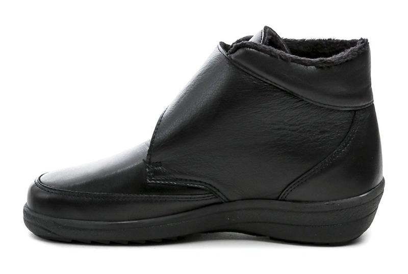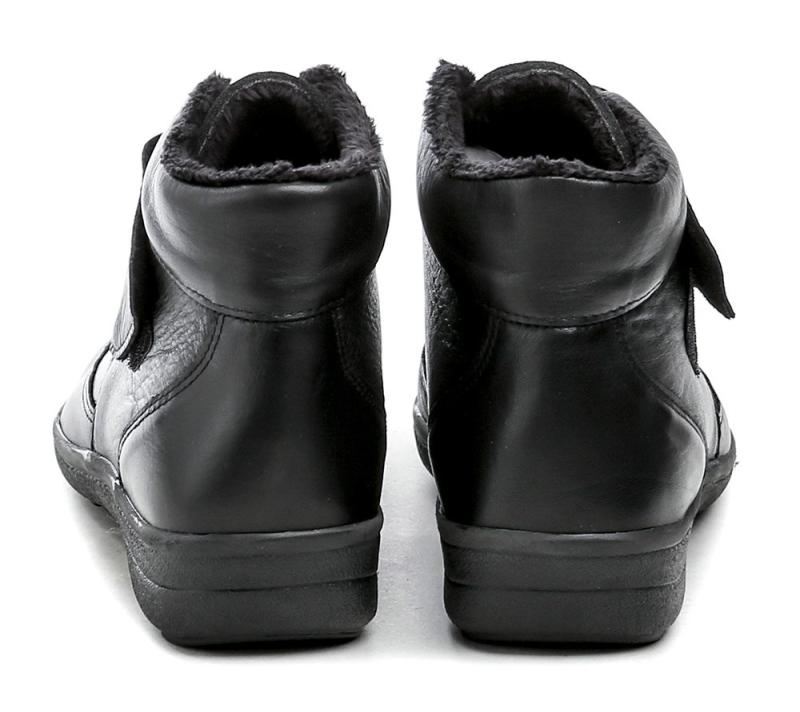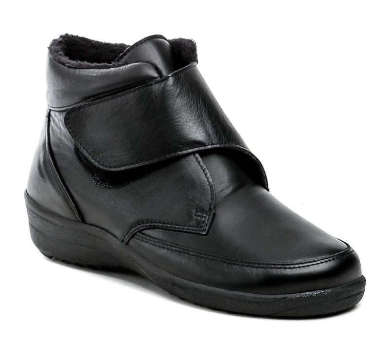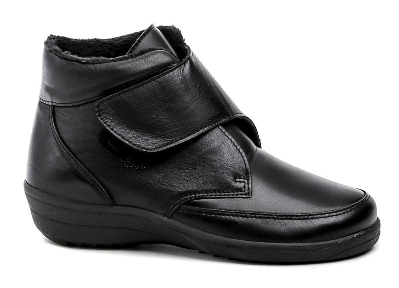 Zimné členkové topánky s extra širokou šírkou a zapínaním na suchý zips, vhodné pre chodidlá s deformitami a výrastkami, z kombinácie kože a pružného materiálu. Zobrazit celý popis