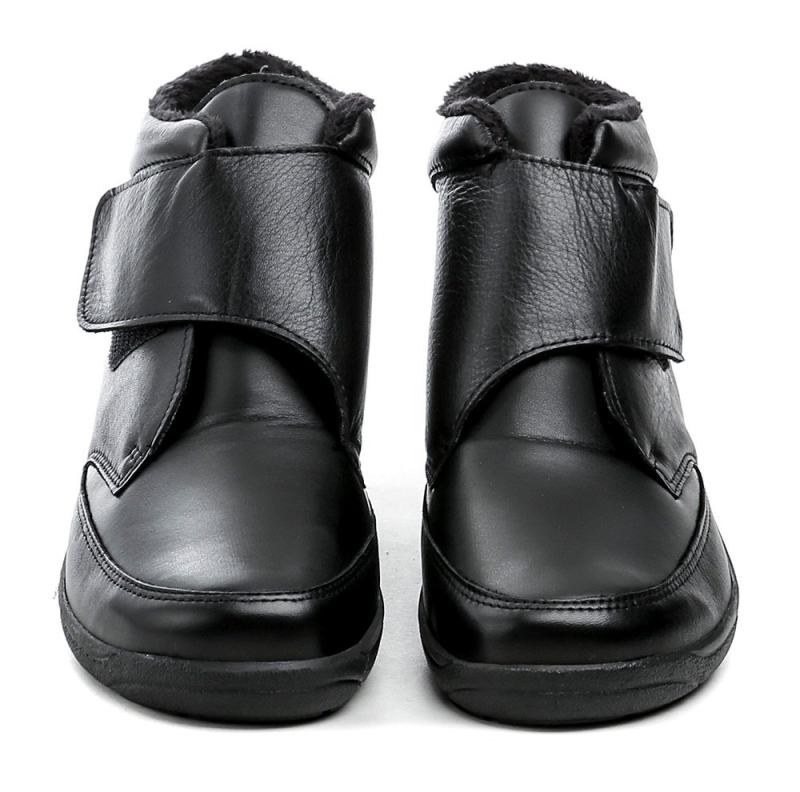 Zimné členkové topánky s extra širokou šírkou a zapínaním na suchý zips, vhodné pre chodidlá s deformitami a výrastkami, z kombinácie kože a pružného materiálu.
