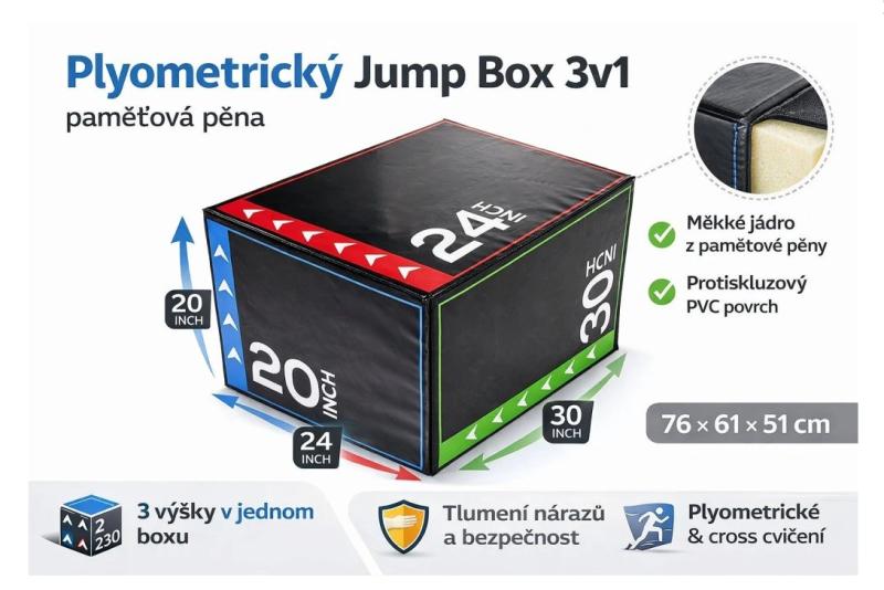 Univerzální box s třemi výškami pro bezpečný plyometrický trénink s vysokohustotní pěnou a protiskluzovým povrchem vhodný pro začátečníky i pokročilé. zobrazit celý popis