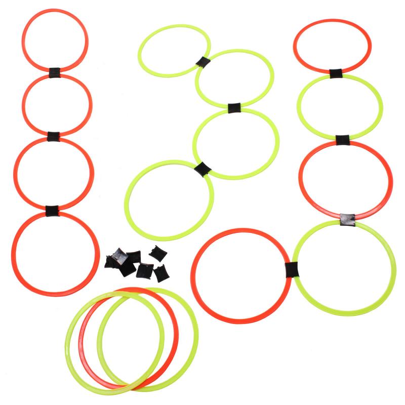 Sada 16 plastových agility kruhov s 20 spojkami umožňuje zostaviť tréningovú dráhu pre kondičnú prípravu športovcov. Súčasťou je praktický vak.